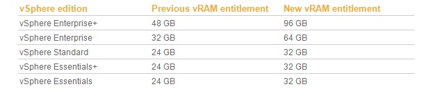 Below is a comparison of the previously announced and the new vSphere 5 vRAM entitlements per vSphere edition: