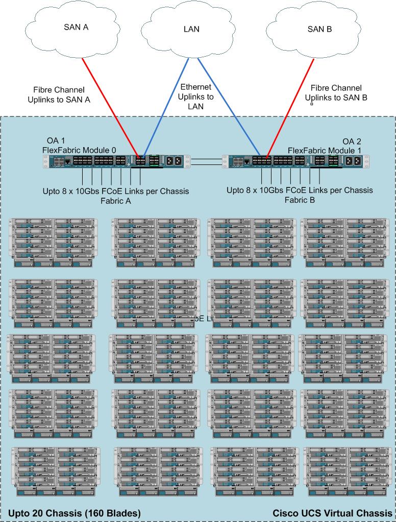 Full Disclosure: I work for Cisco on the UCS Product While the two points above are true (VCEM managing thousands of servers and stacking up to 4 chassis together), there are some caveats that need highlighting around those solutions. For multi-enclosure (ME) stacking to work with the C7000, you must be using Virtual Connect and if any one of the 4 enclosures have VC-FC (or Flex Fabric) for fiber channel storage, then all 4 chassis in the stack also must have VC-FC installed (in the same bays in each enclosure). This is because only the ethernet modules are stacked – not the FC.
