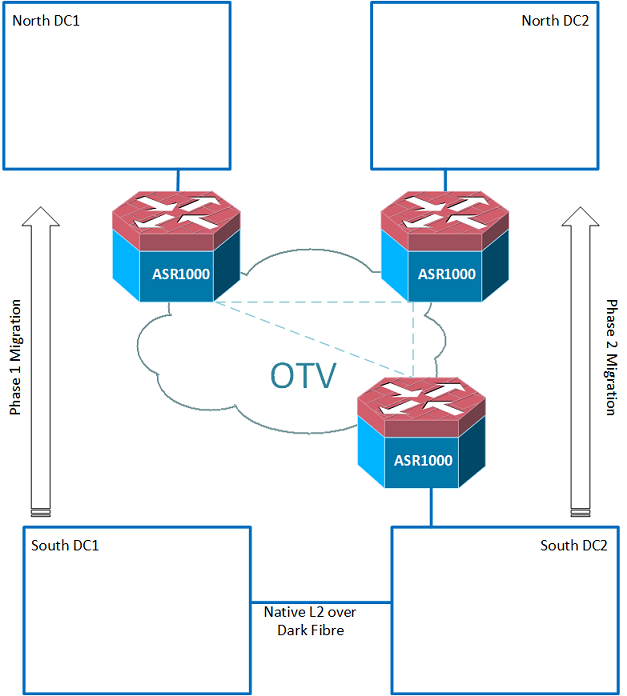 Anyway cutting a long story short I proposed that we located a pair of Cisco ASR 1000’s in one of the southern DC’s and a pair in each of the northern DC’s and use Cisco’s Overlay Transport Virtualisation (OTV) to extend the necessary VLANs between all 4 locations for the period of the migration.