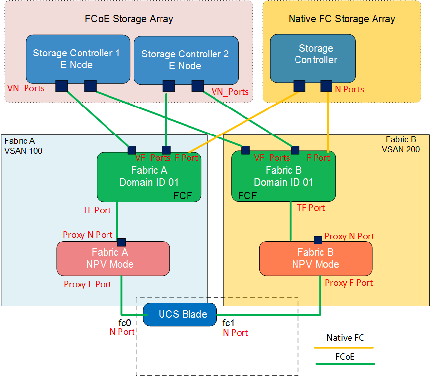 As can be seen from the below Figure in the default NPV mode the Cisco UCS Fabric Interconnect is basically just a proxy. Its server facing ports are Proxy F ports and its Fabric facing (uplink) ports are Proxy N ports.