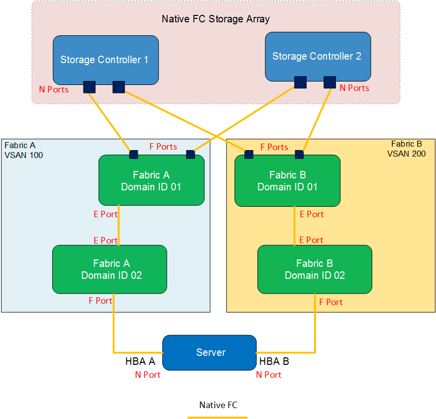 These N Ports are connected to Fabric Ports (F ports) on the Fibre Channel switches.