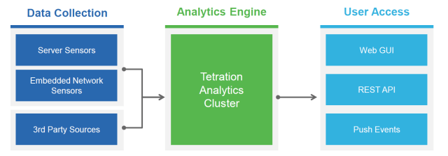 The Cisco Tetration Analytics system can be driven by a GUI, or REST API, and can be configured to push events to other systems if certain criteria is met.