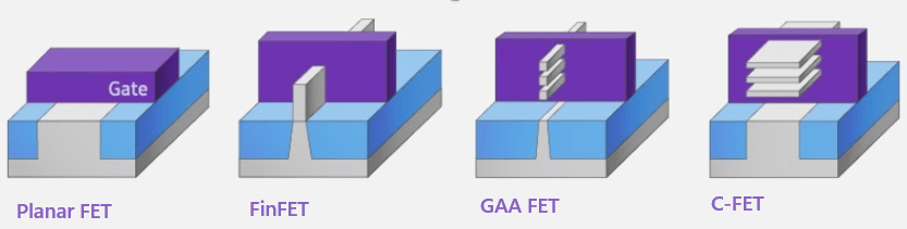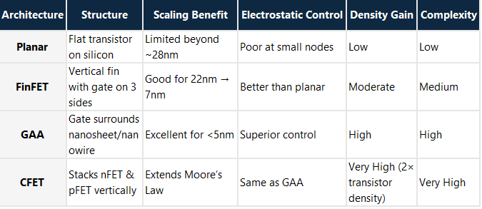 The table and diagram below compares the evolution from Planar → FinFET → GAA → CFET