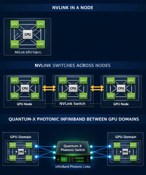 So what role do these photonic switches play? Well lets have a quick review of how GPUs interact with each other. At the node level, NVLink provides a high bandwidth, low latency mesh that connects GPUs (and CPUs) inside a single system, enabling very fast peer‑to‑peer communication and collective operations.